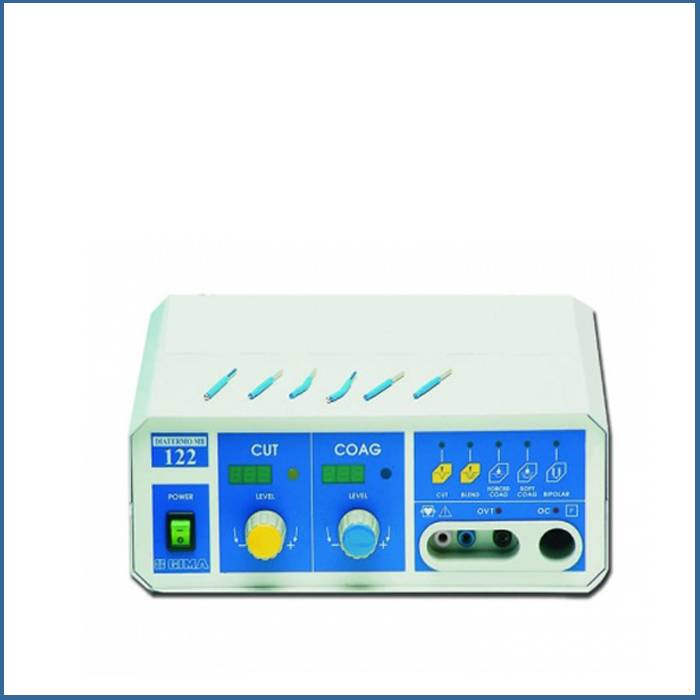 Διαθερμία Gima MB 122 – μονοπολική, ισχύος 120 W με δυνατότητα μετατροπής σε διπολική. Το MB 122 είναι μια ηλεκτροχειρουργική μονάδα υψηλής συχνότητας HF, κατάλληλη για την εκτέλεση μεσαίας μονοπολικής ή διπολικής ηλεκτροχειρουργικής διαδικασίας. Με την επιλογή των τρόπων λειτουργίας παρέχουν καθαρή κοπή, coagulated cut, forced coagulation, soft coagulation, και με την κατάλληλη λαβίδα – διπολική πήξη.